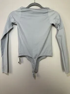 Soft light blue long sleeve bodysuit. Scoop neckline and fitted silhouette. Snap closure at the bottom for easy wear. Versatile staple for layering or styling alone.