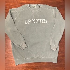 Comfort Colors crewneck with large UP NORTH chest lettering. Vintage-washed soft cotton look. Relaxed fit for everyday wear. Easy to pair with casual outfits.