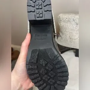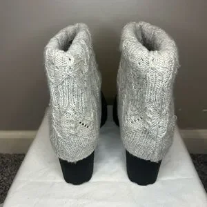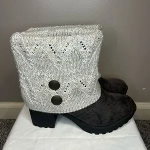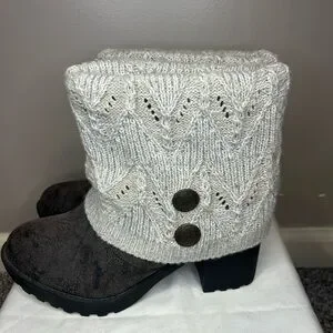 Ankle boots with a textured black foot and a cream knit fold-over cuff. Decorative button details on cuff. Cozy, stylish look for fall and winter outfits.