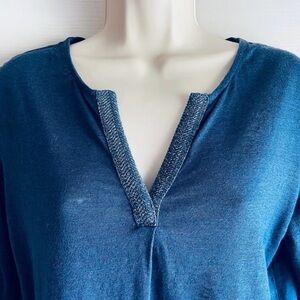 Excellent condition - material tag cut no flaws. Details: split shimmer v neck, 3/4 sleeve, logo at the hip, side slits, slub knit, pullover. Chris style. Laying flat: pit 18.5 inches; length 22.5 inches; shoulder 15.5 inches. Material: Linen blend. Stock photo is to show similar fit. Size is 36 = US 6. Small