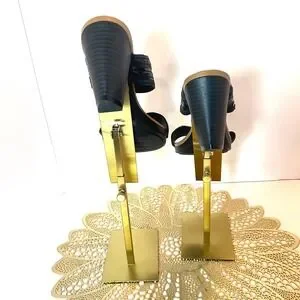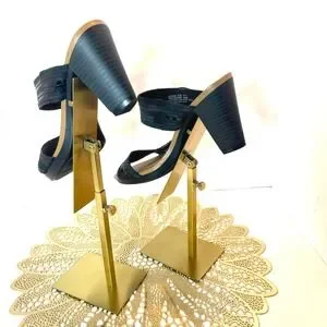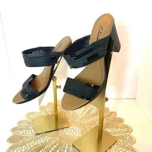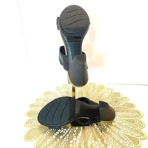 Clarks leather slide sandals feature a sophisticated two-strap design with unique textured detailing. The upper straps combine matte and glossy finishes in a stacked, architectural pattern that adds visual interest to the classic black silhouette. Designed with a comfortable block heel and a cushioned tan footbed, these mules offer a stable lift suitable for all-day wear. Open-toe construction and slip-on style. I touched up the insole. Original price 135.00