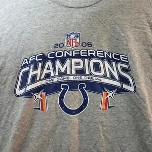 Alstyle Apparel Indianapolis Colts 2006 AFC Conference Champions t-shirt celebrates the historic victory with a bold graphic print. Crafted from a comfortable cotton blend, this heathered grey tee features the official NFL shield and the iconic Colts horseshoe logo. The front display includes the "One Game. One Dream." slogan, commemorating the team's path to Super Bowl XLI. It is designed with a classic crew neck and short sleeves for a relaxed fit.