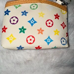 Small cream coin pouch with multicolor monogram print. Includes matching cream keychain or bag charm and handbag-shaped charm. Bright, playful colors. Perfect for keys and small essentials.