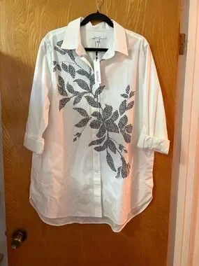 Chico's No Iron Pocketed, White and Black Leaf Print tunic Shirt 3(XL)