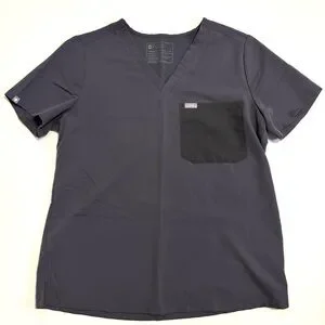 Good condition Figs Catarina One Pocket Scrub Top in Charcoal Gray. V-Neck. Colorblock contrasting dark pocket. Pullover styling. Some slight underarm discoloration as shown.