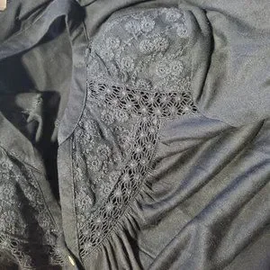 Pair it with a cami, your favorite jeans and black boots for a fashionable outfit. Lightweight and semi sheer. Has see through lace on front decolletage and slightly over the shoulders and a 1.5" see through lace band on the sleeves just above the elbows. Bell sleeves are 3/4 length. High low hem is about 2" longer in the back. Buttons are faux white mother of pearl. This is a very loose fitting, draped top and measures about 18" from pit to pit and 25" from base of neck to bottom of hem in the back. Back also has a seam around waist height with gathering adding to the draping. This is a pre-owned garment in excellent condition.