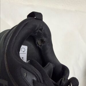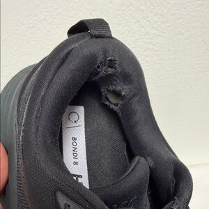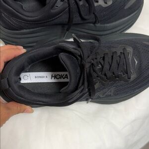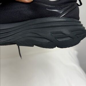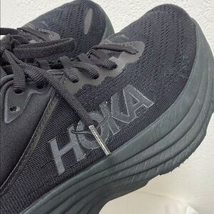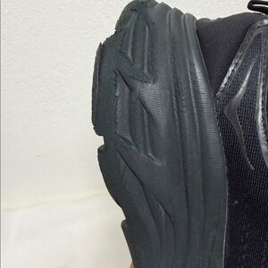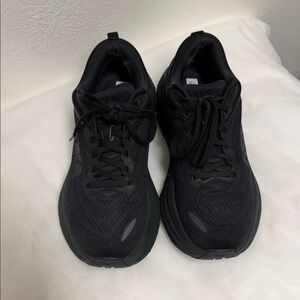 All-black Hoka running shoes. Breathable knit upper with secure laces. Thick cushioned midsole for support. Subtle Hoka logo on the side. See photos for details