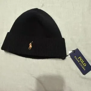 Ralph Lauren Black Cuffed Beanie with Gold Pony Emblem