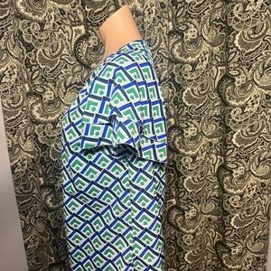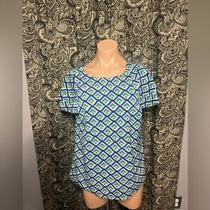 Elevate your wardrobe with this stylish geometric top. Featuring a vibrant blue and green pattern, this top is perfect for any occasion. Pair it with your favorite jeans or skirt for a chic look.
