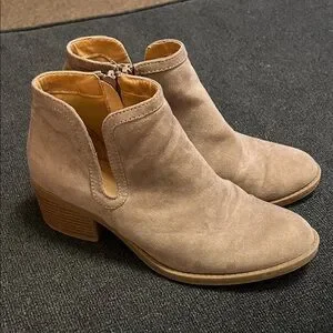 Suede upper in a soft taupe shade. Side cutout with inside zipper for easy on and off. Comfortable stacked block heel for everyday wear. Neutral style pairs with many outfits.