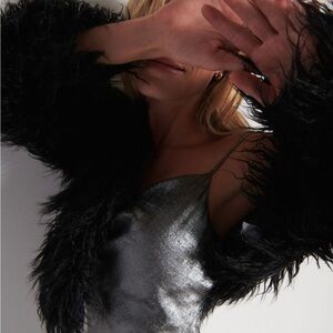 Shimmery metallic slip dress with a soft cowl neckline. Strapless design with slim, elegant silhouette. Subtle texture adds visual depth. Ideal for evening or special events. Tag says size L but would fit a size M too !