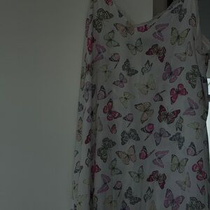 Lightweight slip dress with all-over butterfly print. Thin adjustable straps. Feminine and airy silhouette. Vibrant pink, purple, and yellow butterfly motifs on a white base.
