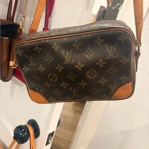 Classic Louis Vuitton monogram crossbody. Coated canvas with iconic LV pattern. Tan leather trim and accents. Adjustable shoulder strap. Timeless and versatile for everyday wear.