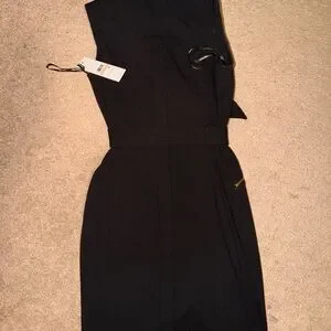 Chic black jumpsuit featuring gold zipper details. Includes a stylish tie waist and sleeveless design.