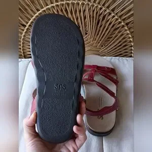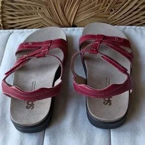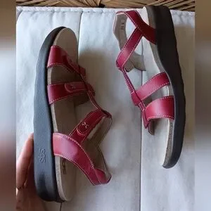 Elegant red leather sandals with adjustable straps. Comfortable black sole for all-day wear.