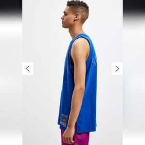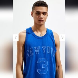 Breathable sleeveless tank with a bold 'New York' and '3' graphic. Lightweight cotton construction for warm-weather comfort. Vibrant blue color for standout casual style. Easy to layer or wear solo for a sporty look.