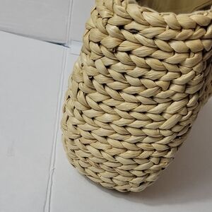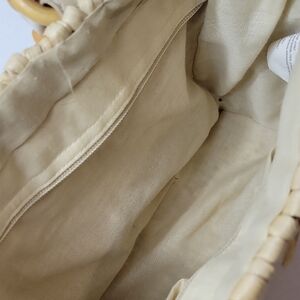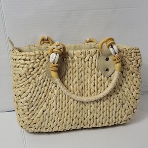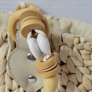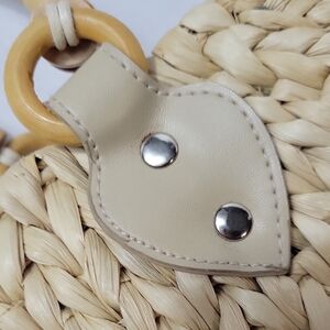 Chic straw crossbody with embroidered cherry accents. Compact design with secure twist-lock closure. Red braided strap for comfortable wear. Natural straw tone with vibrant red cherry detail adds playful color to outfits.