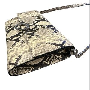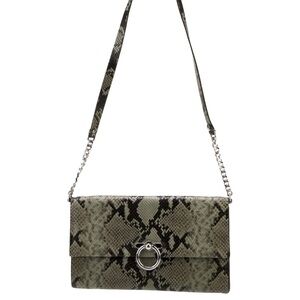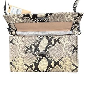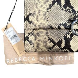 Elevate your look with this stunning Rebecca Minkoff Jean Convertible Clutch. Crafted from natural python-embossed leather, this bag is a versatile powerhouse. Carry it as a chic clutch for a night out or use the optional silver chain and leather strap for a hands-free crossbody experience. The silver O-ring closure adds a modern edge to the exotic print. Compact yet roomy enough for your essentials with interior card slots and a zip pocket. Brand new with original tags attached!