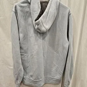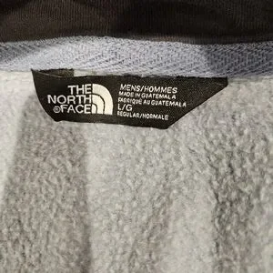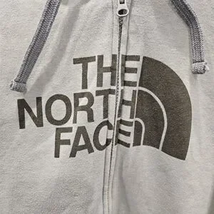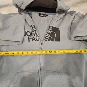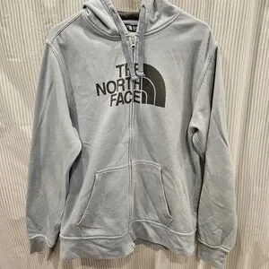 Light gray hoodie with front zip. Features The North Face logo. Comfortable and stylish for everyday wear. please see all photos. I believe this is a males sweater. please see photos for signs of wear noted. good condition.