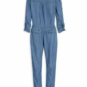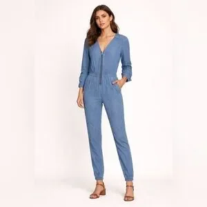 Sleek light blue denim jumpsuit by bebe. V-neck with full front zipper. Elasticized waist and ankle cuffs. Long sleeves and side pockets. Streamlined, versatile silhouette.