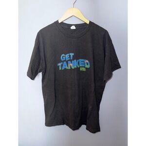 Vintage-inspired graphic tee showcases the Animal Planet brand with a playful "Get Tanked" slogan. The design features vibrant clownfish and aquatic greenery set against a classic black backdrop, printed on a durable Alstyle Apparel & Activewear base. This short-sleeve crewneck offers a relaxed fit, perfect for nature enthusiasts or fans of early 2000s cable television nostalgia.