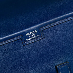 This Jige Elan 29 features a Swift leather body in Bleu Saphir color, and a front flap with a pull-through closure. It carries a B+ condition rating.