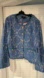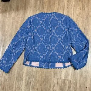 Feminine cropped blazer in intricate royal blue lace. Features gold-tone buttons down the front. Front patch pockets add structure. Scalloped hem and cuffs deliver delicate detail. Lightweight lined piece perfect for layering.New, no returns.