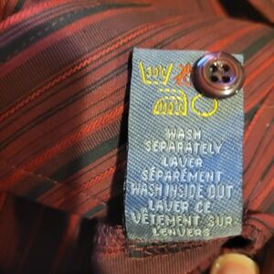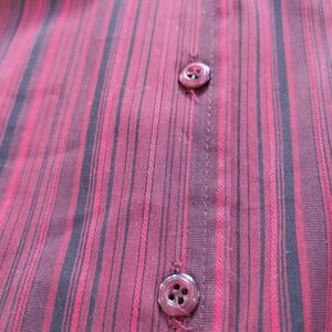 Button-up blouse featuring a classic collar and a vertical pinstripe pattern in rich shades of burgundy, red, and black.