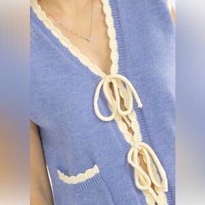 Stylish blue knit vest with cream trim. Features front pockets and tie closure.