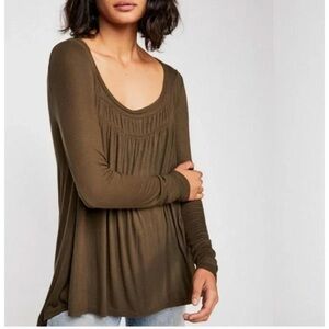 Relaxed-fit long sleeve top with a scoop neckline. Soft, drapey fabric with subtle front pleating. Simple, versatile silhouette for easy styling.