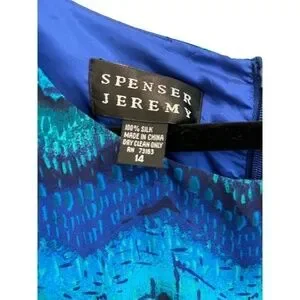 This stunning Spenser Jeremy dress is a must-have for any fashion-forward woman. The dress features a beautiful geometric pattern in shades of blue and green, with a layered design that adds depth and dimension. The material is luxurious silk, ensuring a soft and comfortable fit that drapes beautifully over the body. The dress has short sleeves and a round neckline, with a zip closure for easy dressing. It's perfect for a variety of occasions, from weddings to parties, and has been designed with the modern woman in mind. The dress is fully lined and lightweight, making it ideal for travel. Garment care instructions recommend dry cleaning only.