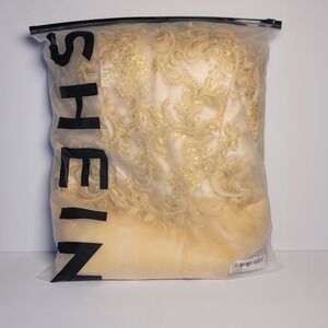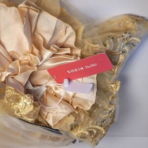 Keywords: Shein Belle Dress, Gold dress, Champagne dress, Embroidered dress, Mesh dress, Fit and flare dress, Party dress, Cocktail dress, Prom dress, Special occasion dress, Women's dress, Formal dress, Shiny dress, Sequin Dress