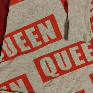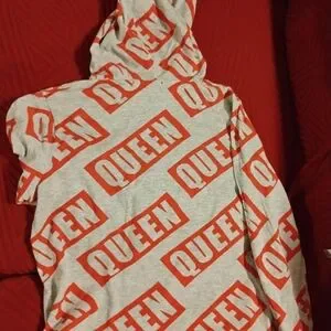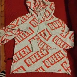 Casual Que hooded sweatshirt in gray with bold red all-over print. Soft, cozy fabric for everyday comfort. Oversized fit with adjustable hood and long sleeves. Stylish statement piece that pairs easily with denim or leggings.