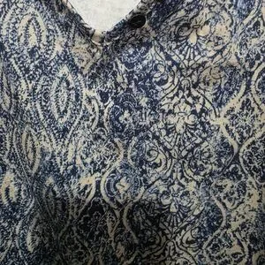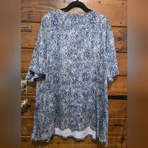 Woman's plus size blue patterned shirt. Catherine's brand. Size 5x. Gently used. Been in house storage. Please look at the pictures. I tried to capture the true color of the shirt and any defects/dirt etc. in the close up pictures. There are no obvious signs of defects that I can tell. Overall, this shirt is in excellent used condition.