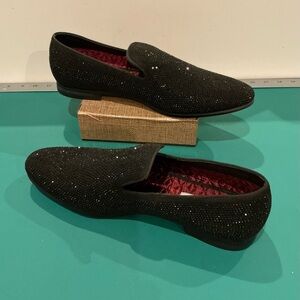 Black slip-on loafers with full crystal embellishment. Sleek silhouette for formal or evening wear. Padded interior for added comfort. Easy to pair with dress or tailored outfits. EUC looks like they were never worn