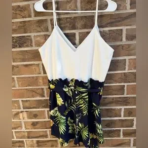 Stylish white and navy spaghetti strap shorts romper with tropical leaf print. Perfect for summer outings.