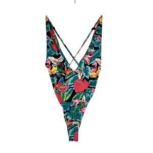 Keywords: one piece swimsuit, tropical print, plunge neckline, high cut, beachwear, poolside, vacation, resort wear, bold print, statement swimsuit, summer fashion, athletic swimsuit, trendy, fashionable