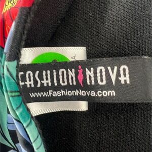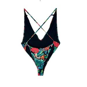 Make a bold statement with this vibrant Fashion Nova one-piece swimsuit. Embrace the allure of a tropical paradise with its eye-catching floral print set against a deep black background, featuring lush green leaves, vivid red anthuriums, and pops of yellow and pink blossoms. The plunging neckline and high-cut leg create a stunning silhouette, while the criss-cross back straps offer both support and a touch of allure. This striking swimsuit is perfect for turning heads on your next beach vacation, poolside lounging, or a glamorous resort getaway.