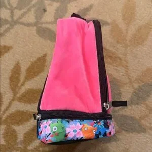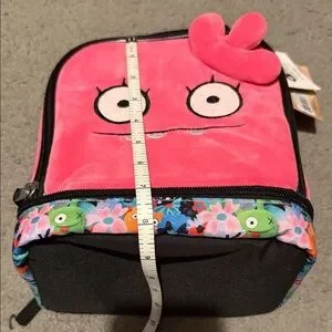 Cute pink monster lunch bag with a bow. Features a colorful floral and character design.