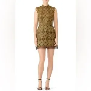 Intricate, openwork lace defines the striking drama of this regal mini dress by CATHERINE DEANE. Gold lace (100% Polyester). Hourglass. Cap sleeves. Mock neckline. Hidden back zipper with exposed button closure at neck. Partially lined. 33" from shoulder to hemline.