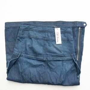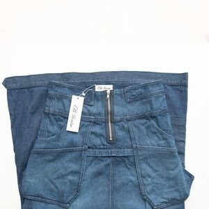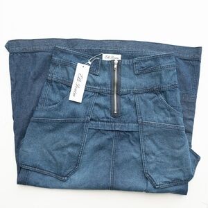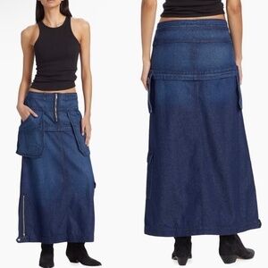 This EB Denim maxi skirt has a structured, low-slung silhouette with a straight, slightly A-line shape that gives it a clean, utilitarian feel. Made from sturdy 100% cotton denim, it features oversized patch and cargo pockets, an exposed zip fly, and snap details that add to its functional, street-inspired look. Side zip slits offer adjustable movement and a bit of edge, while the modular design allows it to convert from a full-length maxi into a shorter micro mini style. The darker blue wash keeps it versatile and easy to style with everything from fitted tanks to oversized knits. A strong, fashion-forward piece with a mix of structure and practicality.
