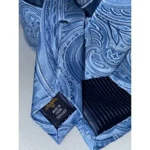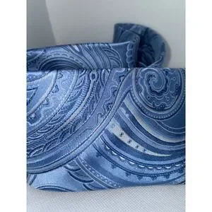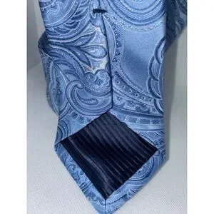 Eagle Shirtmakers necktie crafted from 100% silk features a sophisticated blue paisley pattern with intricate woven detailing. The tonal blue palette offers a classic yet modern aesthetic suitable for professional or formal occasions. This high-quality accessory includes a keeper loop on the reverse side and a contrasting navy blue tipping for a polished finish.