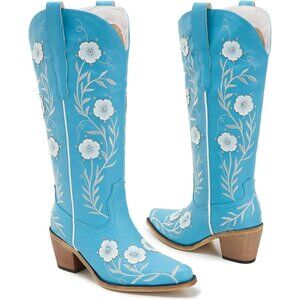 Eye-catching turquoise boots adorned with beautiful white floral embroidery and traditional western stitching, adding a touch of elegance to every outfit.