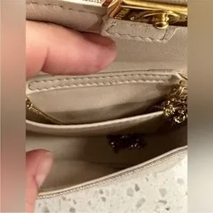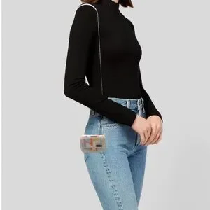 Includes the chain to crossbody as well This is a perfect bag when you go to concert you clip it onto your jeans are your belt loops it fits your lipstick, a key, credit cards and money does not fit your phone. And then you click it onto your bags for easy access to your key, lipstick and your ID.