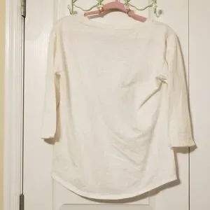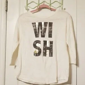 Off White shirt with the word WISH on the front. Soft fabric, very lightweight. Fabric is made of 60% Cotton and 40% Polyester.