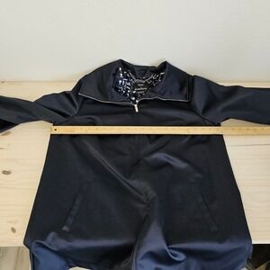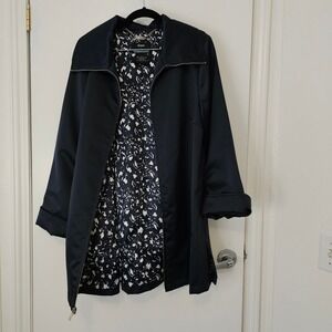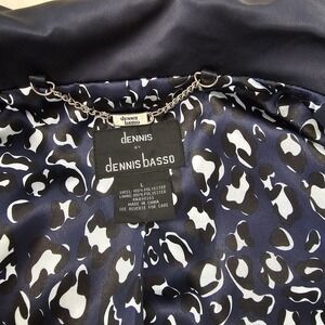 A stylish navy blue jacket by Dennis by Dennis Basso. This lightweight piece features a sleek silver zipper front and a unique, eye-catching patterned lining. The collar adds a modern touch, and the cuffs can be worn rolled or unrolled, showcasing subtle button details. Convenient side pockets offer functionality. Coat or Jacket is in a Springtime weight and the material has a sheen to it. No issues to note.