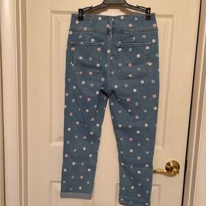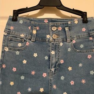 Light blue denim jeans with scattered small floral prints. Pastel flowers in pink, yellow, and blue create a playful look. Classic waistband with visible stitching. Casual, youthful style.NWOT