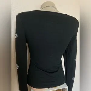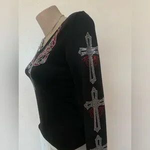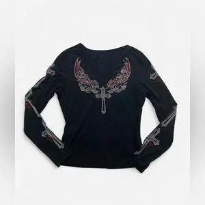 Black Long-sleeve Top with Red & Silver Rhinestones Cross & Wings Design