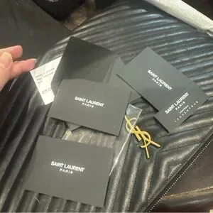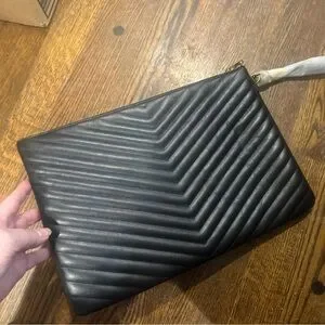 Elegant black clutch with gold YSL logo & gold zipper. Chevron quilted design. Soft 100% leather. A few creases on one side from sitting up against other handbags in my closet~you can visually see them in the listed pictures. Sleek and stylish. Wristlet included/detach is optional. Credit slots inside. Very roomy clutch. NEW/DUST BAG INCLUDED/NEVER USED! Made in Italy! Beautiful/Classy/Timeless.