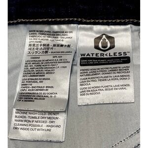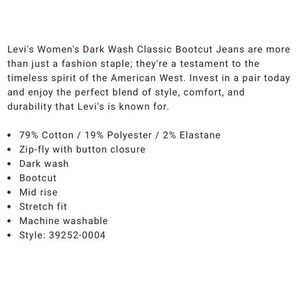 The product is a pair of Levi's Classic Bootcut Dark Wash Jeans in a women's size 18W. These mid-rise jeans feature a solid pattern, dark wash fabric, and a comfortable cotton blend material. With a classic fit and bootcut style, these jeans have a zip and button closure, 5-pocket design, and are machine washable. The blue color and Levi's logo accents make these jeans a versatile and stylish addition to any wardrobe, suitable for all seasons. Made in Sri Lanka, these jeans offer comfort, stretch, and practicality for everyday wear.